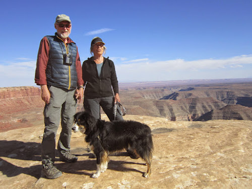 But that glory was quickly outdone by beautiful Muley Point on Cedar Mesa, high up over Gooseneck, by way of eight miles up the steepest, narrowest, gravel road imaginable. This road, Muki Dugway, twisted into hairpins, S's, U's, and every contortion imaginable in those few miles. Although Muley Point could be a dramatic trip highlight, Phil's notes and tales of hiking, imply we have even more glorious exploration ahead.